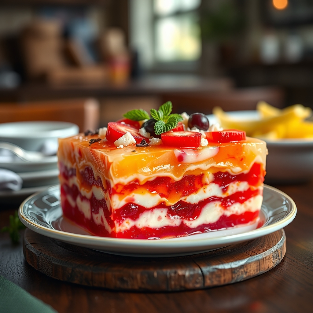 A retro-inspired layered gelatin salad with vibrant colors and sweet-tangy flavors. Perfect for potlucks, holidays, or as a nostalgic dessert.