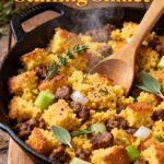 A savory skillet dish featuring cornbread mixed with herbs, vegetables, and sausage, baked to perfection.
