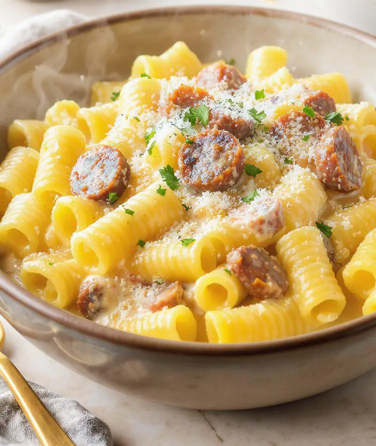 A creamy pasta dish featuring Italian sausage, rigatoni, and a rich sauce.