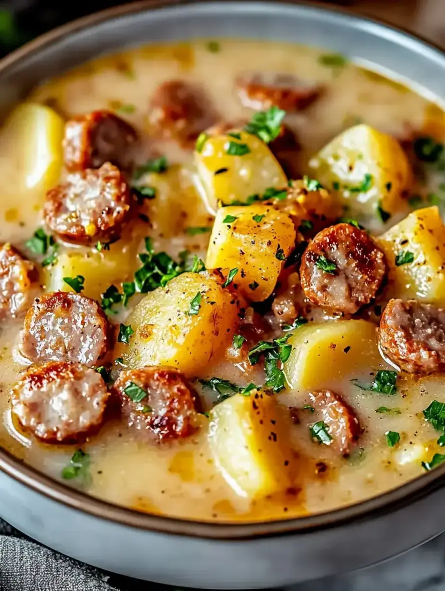 A steaming bowl of homemade Creamy Sausage and Potato Chowder, the ultimate comfort food.