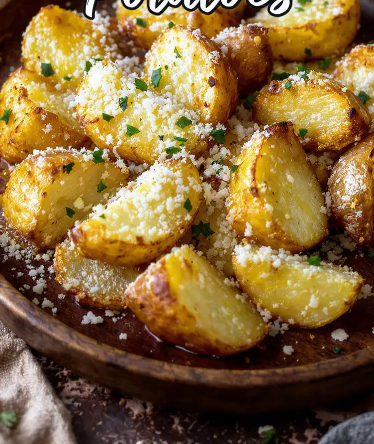 These crispy parmesan roasted potatoes are golden and crunchy on the outside with a fluffy interior, flavored with garlic and herbs.