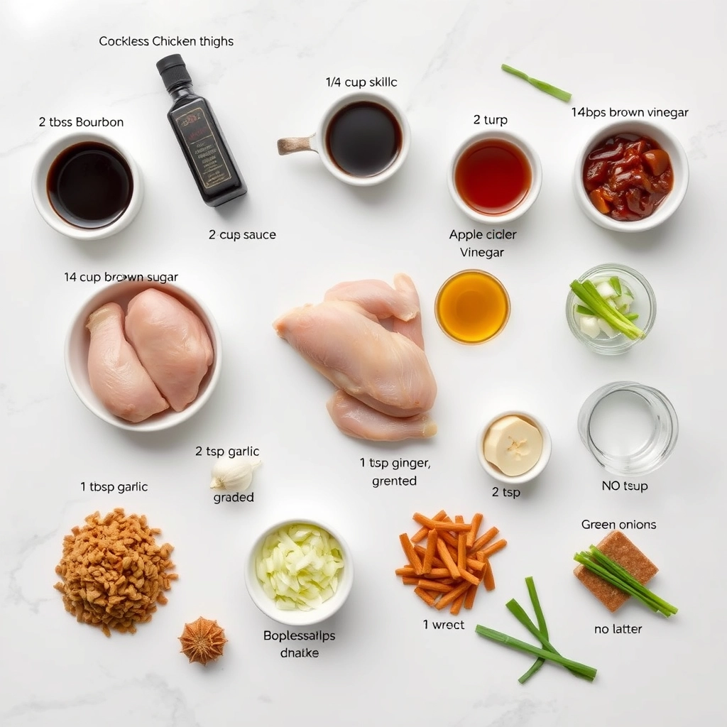 - In a bowl, whisk together bourbon, soy sauce, brown sugar, ketchup, apple cider vinegar, garlic, ginger, and red pepper flakes.