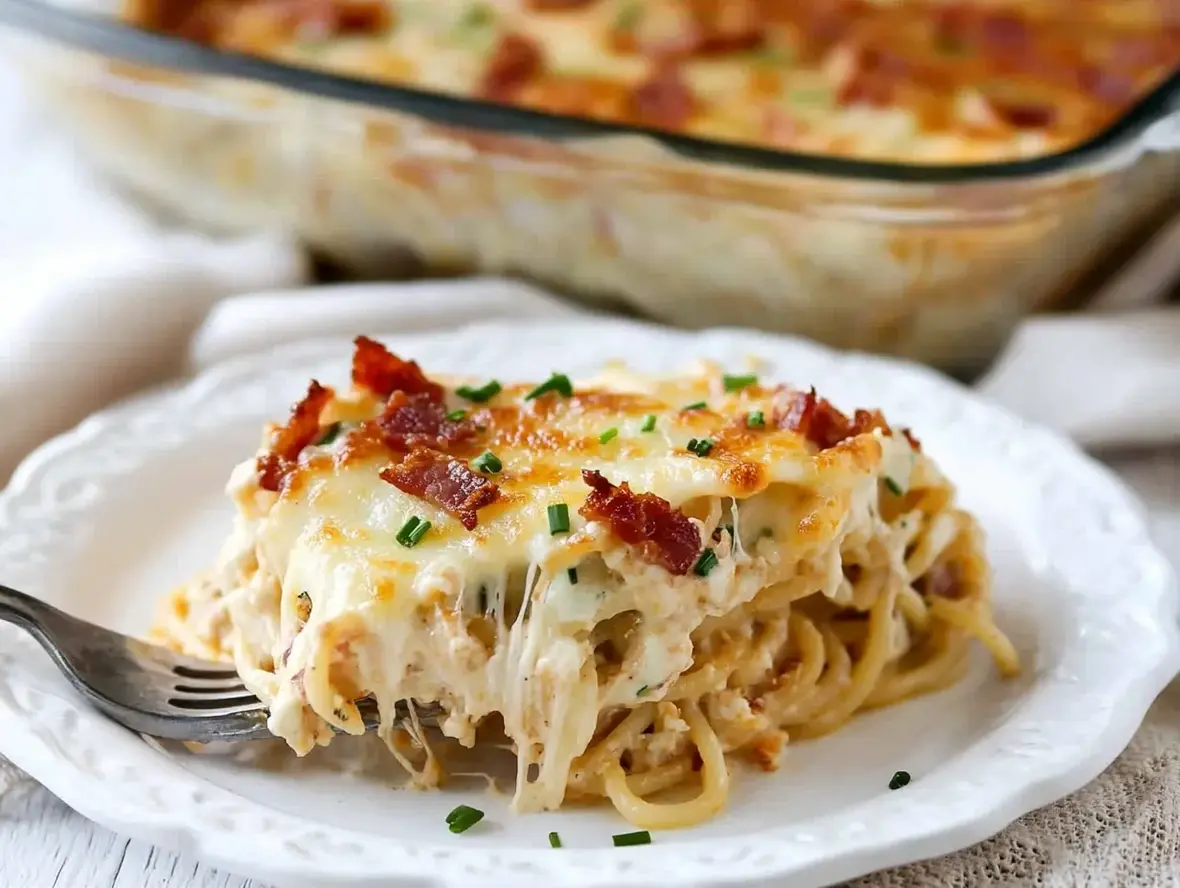 - 1️⃣Preheat oven: Set your oven to400°F (200°C). Grease a9×13-inch baking dishand set aside.2️⃣Make the sauce: In a large pot over medium heat, combinemilk, cream of bacon soup, whipped chive cream cheese, salt, pepper, garlic powder, and onion powder. Stir well and bring to a gentle boil.3️⃣Cook the pasta: Once the liquid is boiling, break the spaghetti noodles in half and add them to the pot. Reduce heat tomedium-lowand cook for8 minutes, stirring occasionally.4️⃣Add cheese & turkey bacon: Stir in2 cups of shredded mozzarellaand½ cup of turkey bacon bits, mixing until fully incorporated.5️⃣Transfer to baking dish: Pour the spaghetti mixture into theprepared baking dish, spreading it evenly.6️⃣Add toppings: Sprinkle the top with2 more cups of shredded mozzarella, chopped chives, and turkey bacon bits.7️⃣Bake: Place the dish in the oven and bake for14-15 minutes, or until the cheese isfully meltedand slightly golden around the edges.8️⃣Let it rest: Remove from the oven and let the baked spaghetti sit fora few minutesbefore serving.