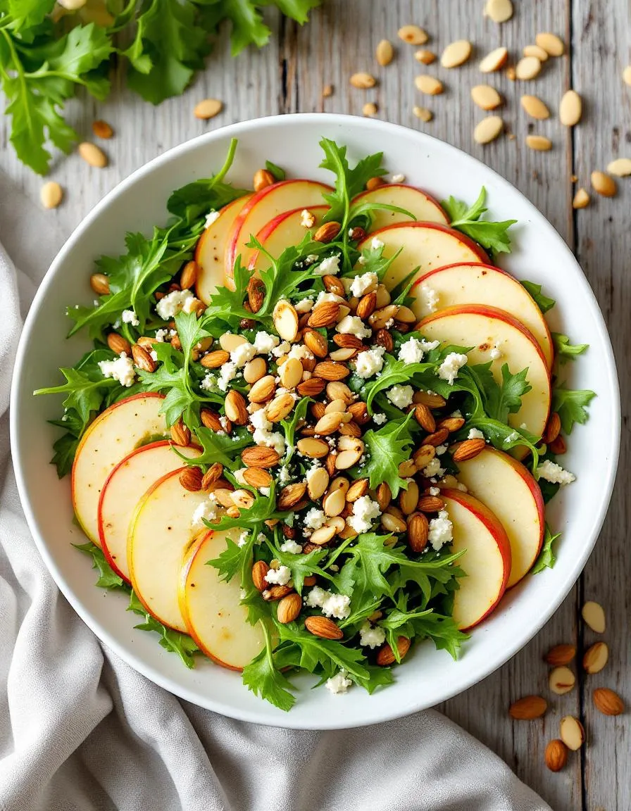 - In a large bowl, combine arugula, apple slices, almonds, and feta cheese.