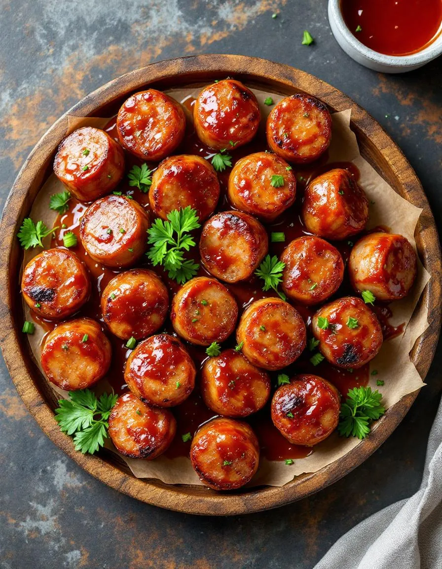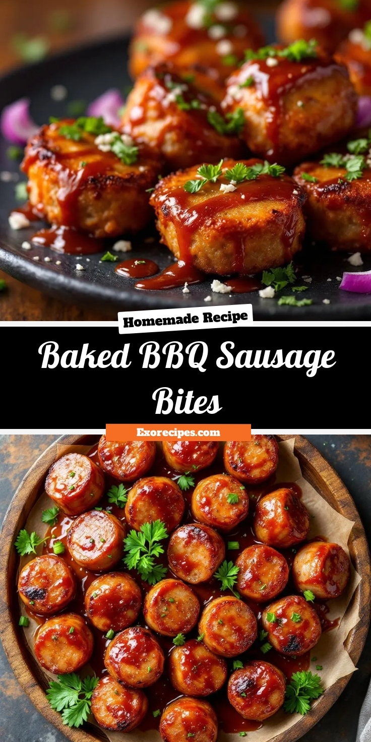 Juicy sausage bites coated in tangy BBQ sauce, baked to perfection for a quick and flavorful appetizer or main dish.