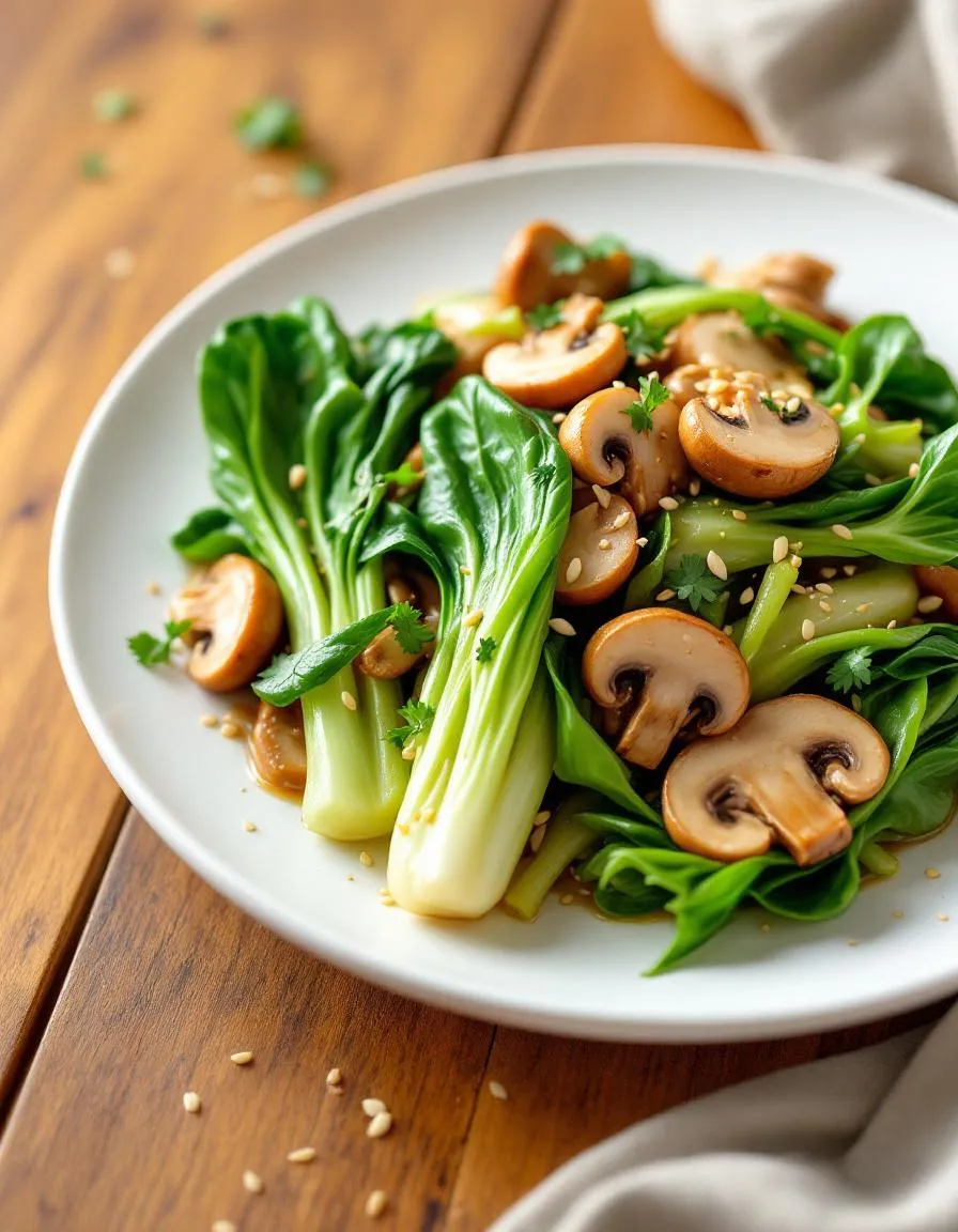 A quick and healthy stir fry featuring crisp bok choy and savory mushrooms in a light garlic sauce.