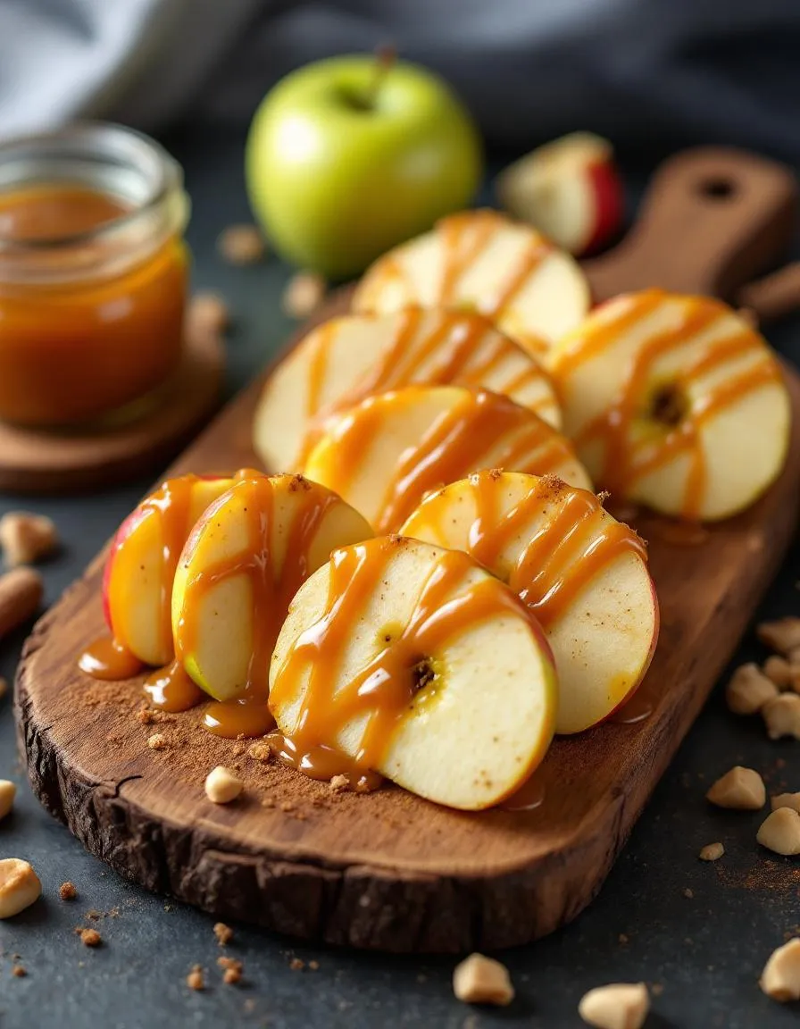 Sweet and crunchy apple slices topped with gooey caramel and a sprinkle of cinnamon, perfect for a quick fall treat.