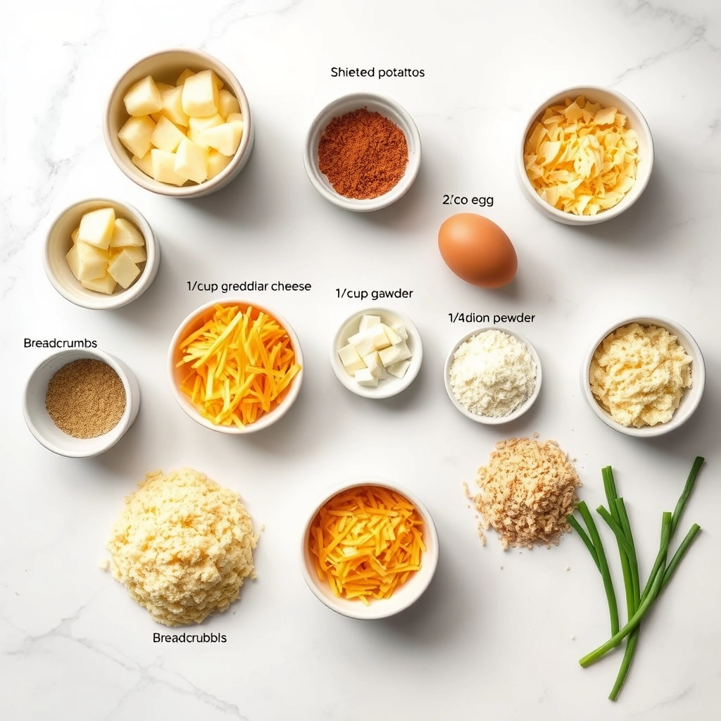 - In a large bowl, mix mashed potatoes, cheddar cheese, Parmesan cheese, egg, breadcrumbs, garlic powder, onion powder, salt, and pepper until well combined.