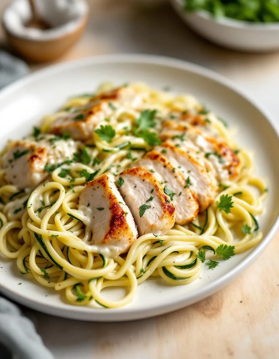 A low-carb twist on classic chicken Alfredo, using zucchini noodles for a lighter meal.