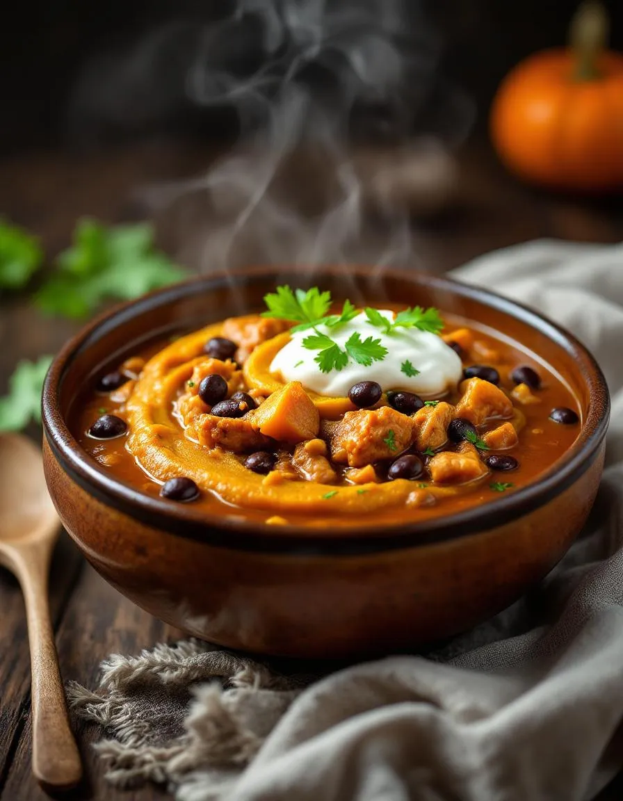 A hearty and flavorful chili featuring tender chicken and sweet pumpkin, perfect for a cozy meal.