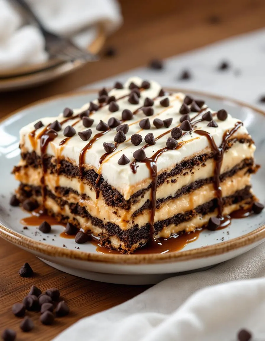A decadent no-bake dessert lasagna with layers of chocolate, cream cheese, and whipped topping.