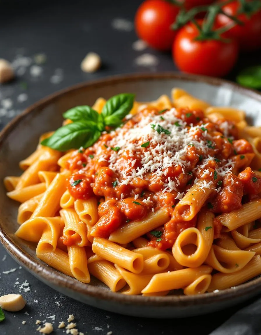 A rich and comforting pasta dish featuring a velvety tomato cream sauce with garlic and herbs.