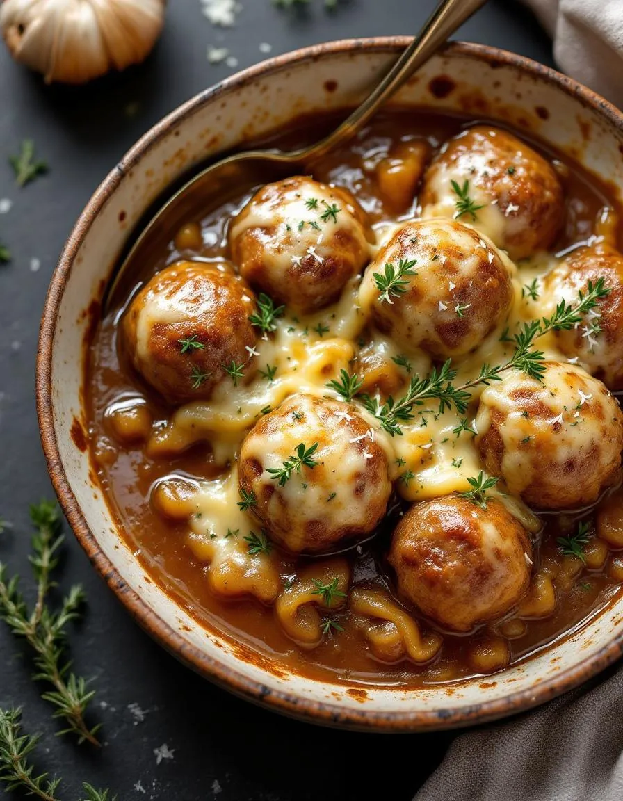 Savory meatballs simmered in a rich French onion soup-inspired gravy, topped with melted Gruyère cheese.