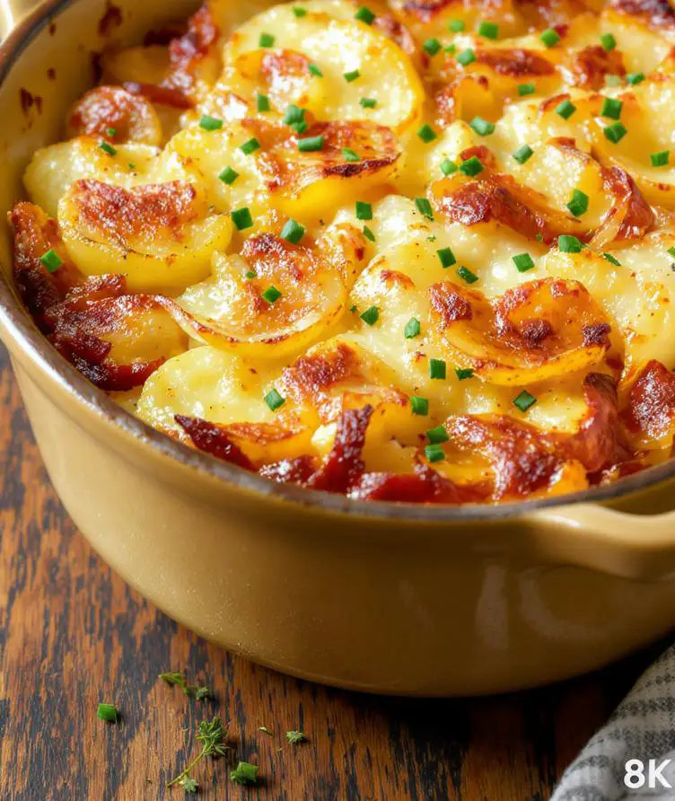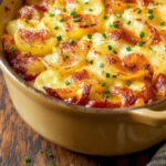 Imagine thinly sliced potatoes layered with deeply caramelized onions, all bathed in rich beef broth and topped with melted Gruyere cheese for that irresistible cheesy potato bake experience.