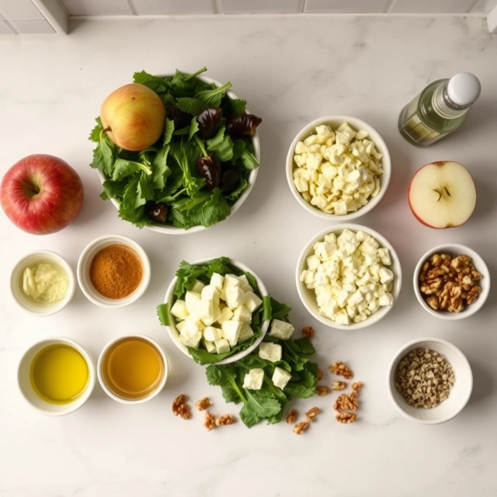 - In a large bowl, combine the mixed greens, sliced apples, feta cheese, and walnuts.