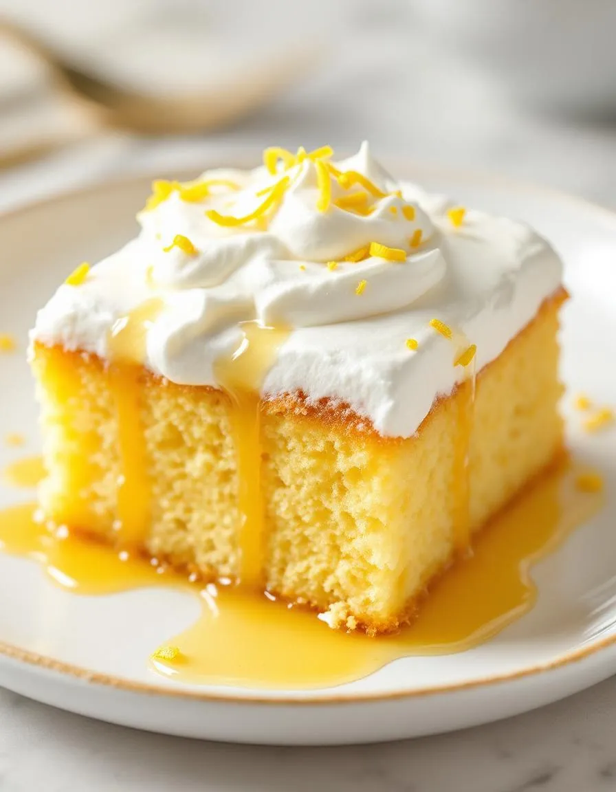 A moist and tangy lemon cake soaked with sweet lemon syrup, topped with whipped cream and lemon zest.