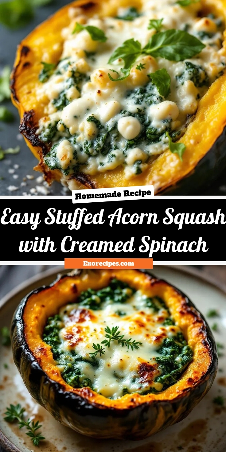 A comforting autumn dish featuring roasted acorn squash halves filled with a rich, creamy spinach and cheese mixture.