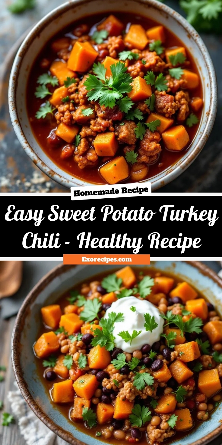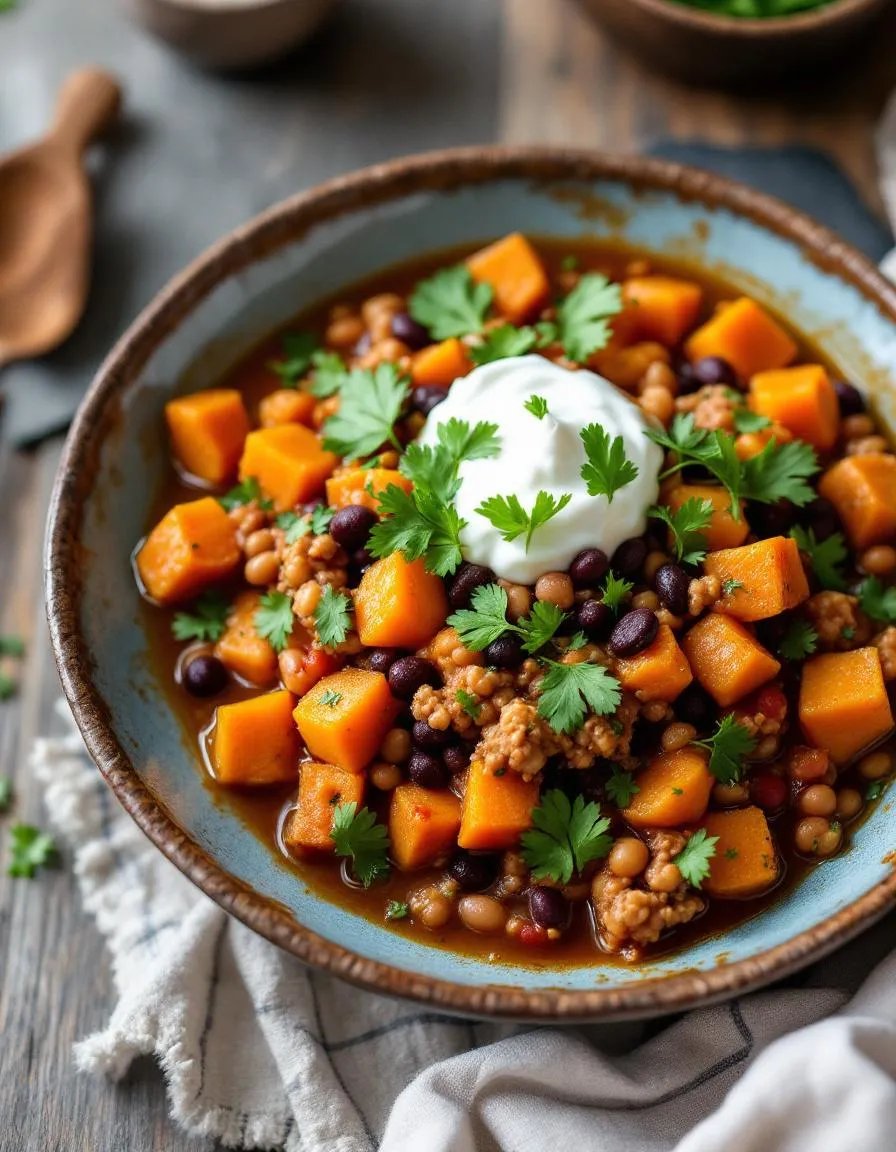 A hearty and healthy chili featuring lean ground turkey and sweet potatoes, packed with flavor and nutrients.