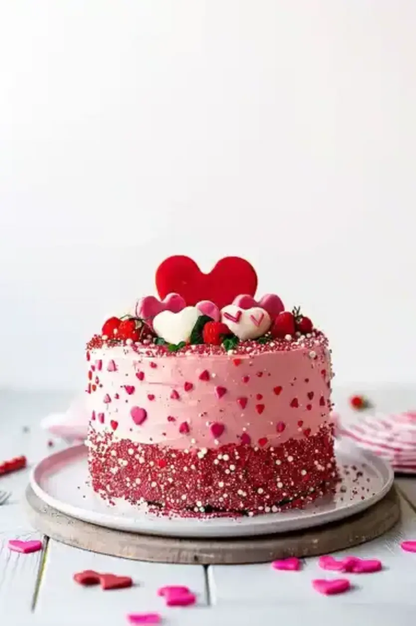 Decorations like heart-shaped sprinkles bring fun and festivity to this Easy Valentine’s Day Cake, adding a crunchy contrast to the soft layers. Choose nonpareils for their vibrant colors and even distribution; if unavailable, edible glitter or crushed candy can substitute for a similar sparkling effect.
