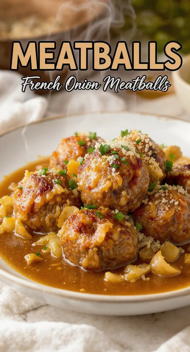 Tender meatballs infused with the flavors of caramelized onions and a savory sauce, inspired by classic French onion soup.