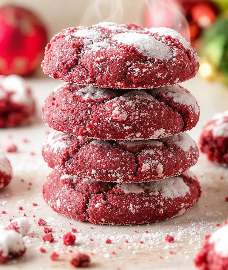 These fudgy red velvet crinkle cookies are soft, chewy, and ideal for holiday gatherings, featuring a rich chocolate flavor with a festive red hue.