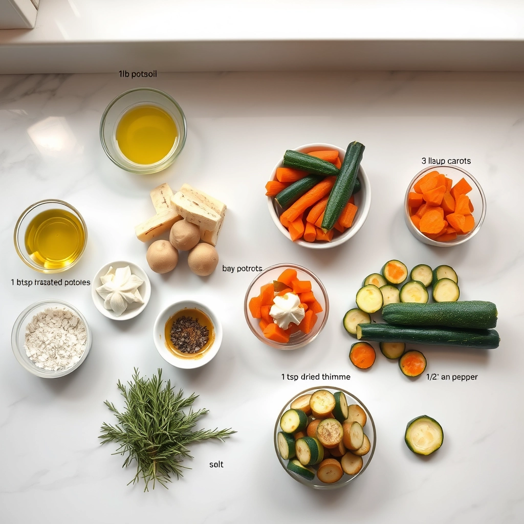 - In a large bowl, combine potatoes, carrots, zucchini, olive oil, garlic, rosemary, thyme, salt, and pepper. Toss until vegetables are evenly coated.