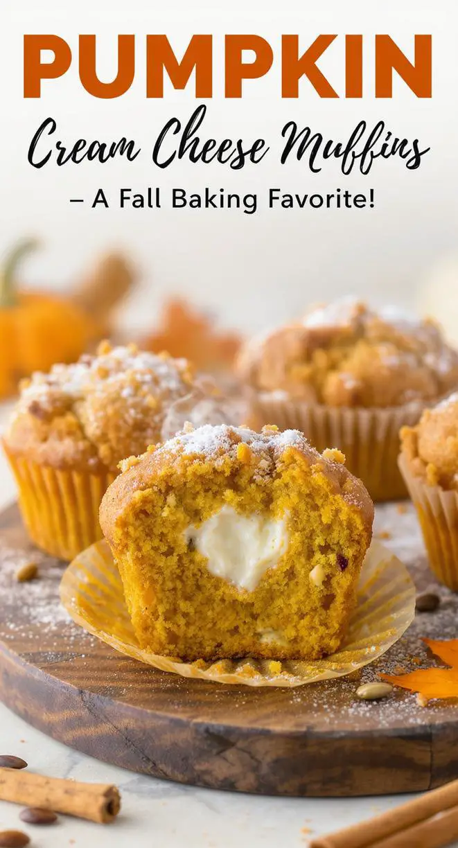These muffins are a cozy fall treat, featuring moist pumpkin batter with a creamy cream cheese filling, perfect for baking and enjoying with coffee.