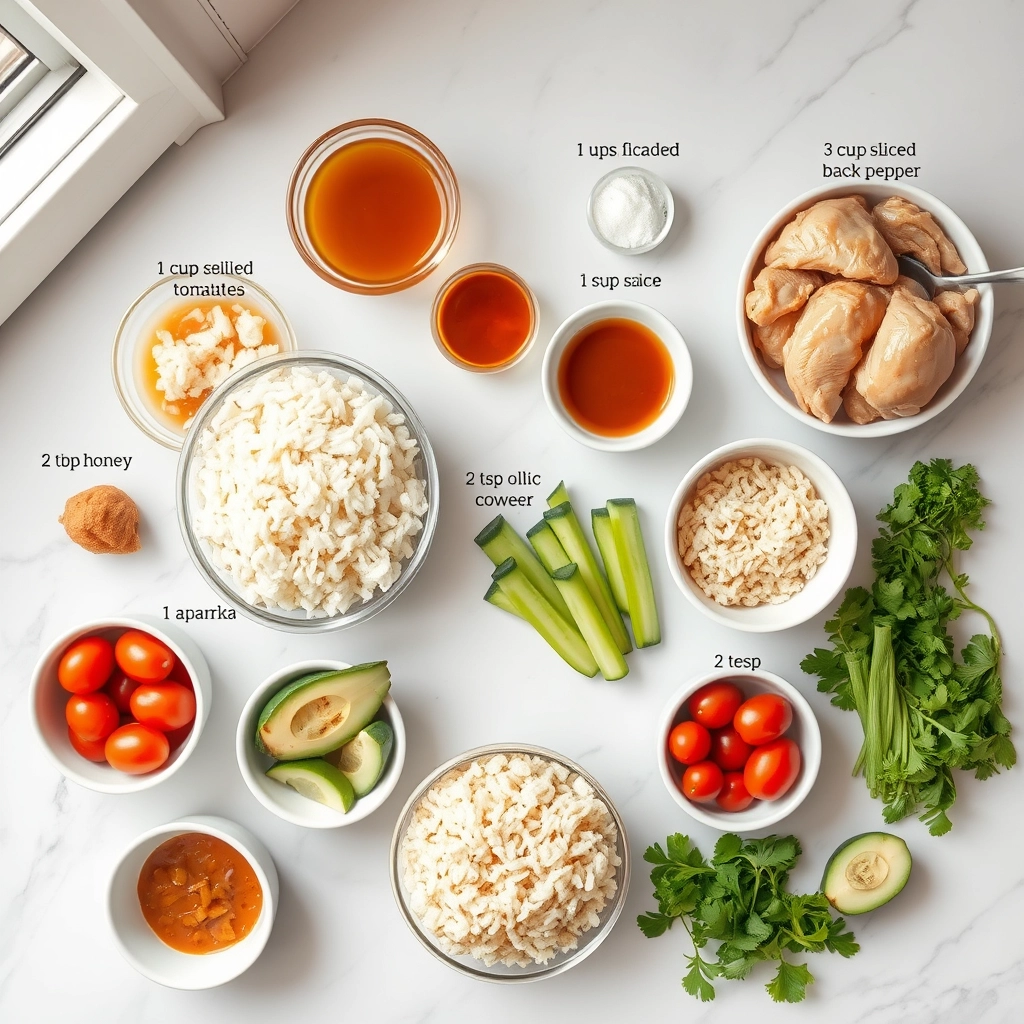 - Assemble bowls with cooked rice, sliced chicken, avocado, cherry tomatoes, cucumber, and cilantro.