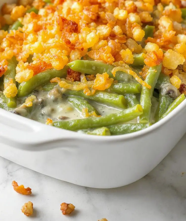 A classic holiday side dish featuring fresh green beans, mushrooms, and a creamy sauce topped with crispy onions.