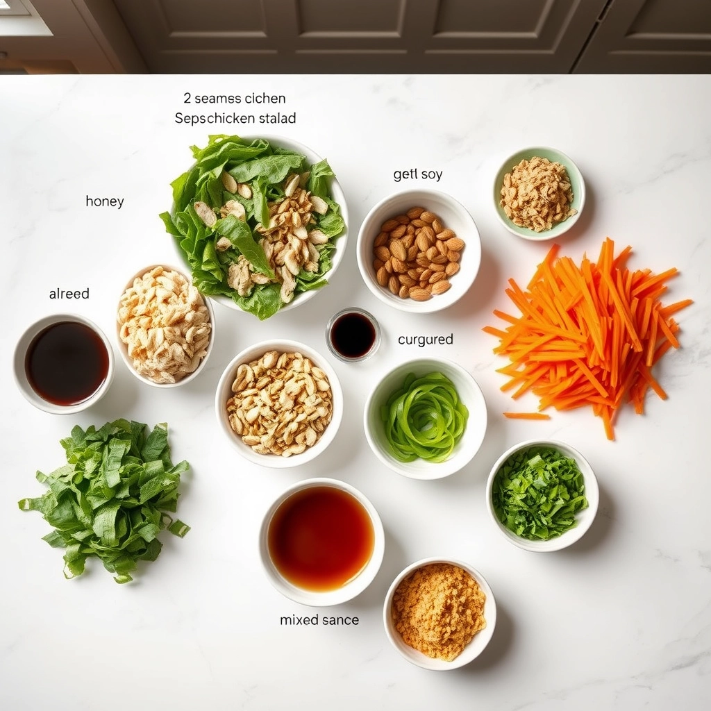 - In a large bowl, combine the shredded chicken, mixed greens, shredded carrots, sliced almonds, sesame seeds, and green onions.