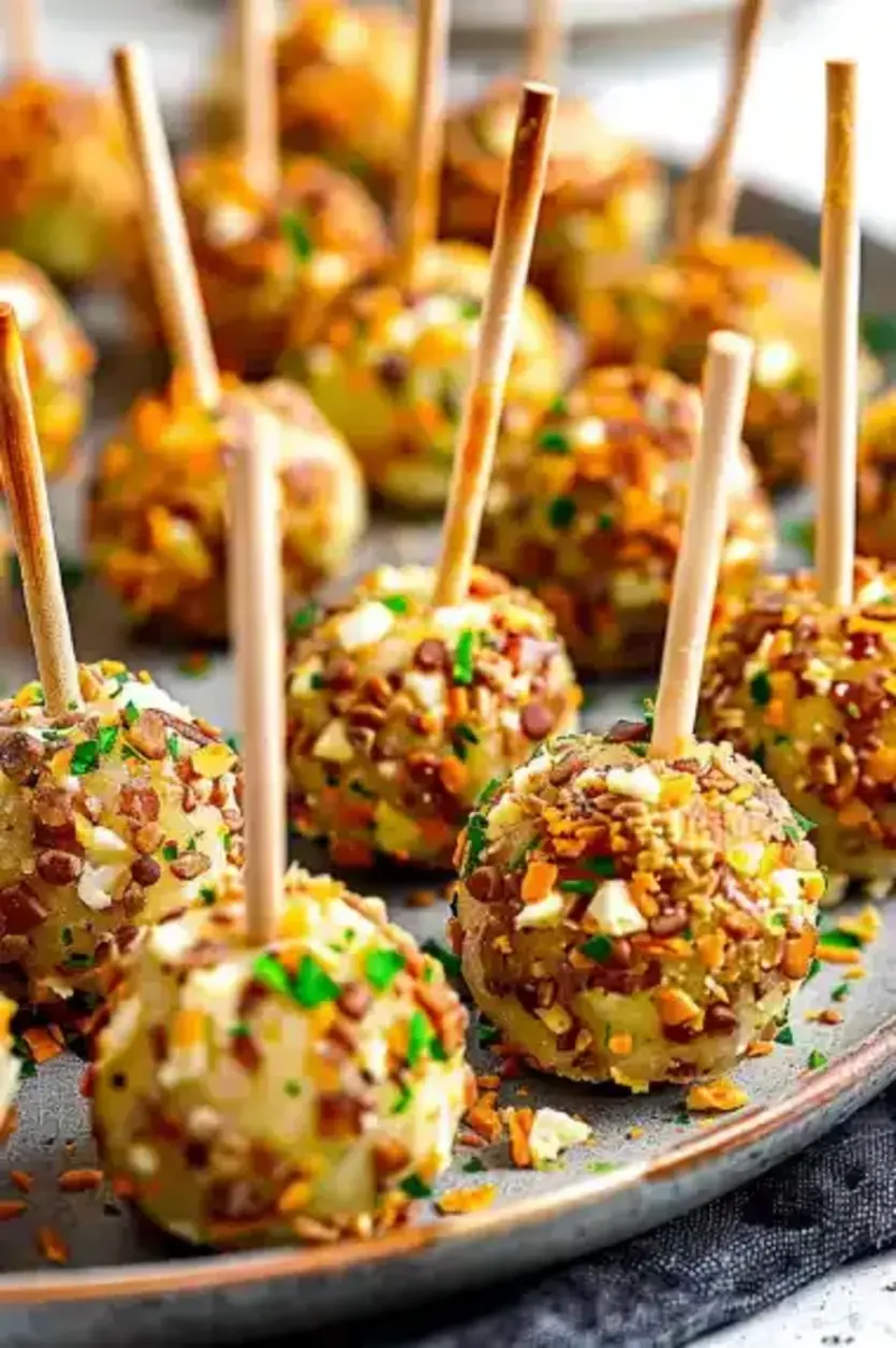 Insert a pretzel stick into each coated cheese ball just before serving, arranging them on a platter for easy grabbing. This adds a fun, edible handle and finalizes your Mini Cheese Ball Bites.