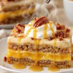 A decadent layered dessert that combines the rich flavors of pecan pie with a no-bake lasagna style, featuring creamy layers and a crunchy pecan topping.