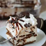 This Oreo Ice Cream Sandwich Cake has 6 delicious layers which consist of ice cream sandwiches, whipped topping, fudge, and crushed Oreos. Repeat and you have the perfect sweet treat that could not be easier!