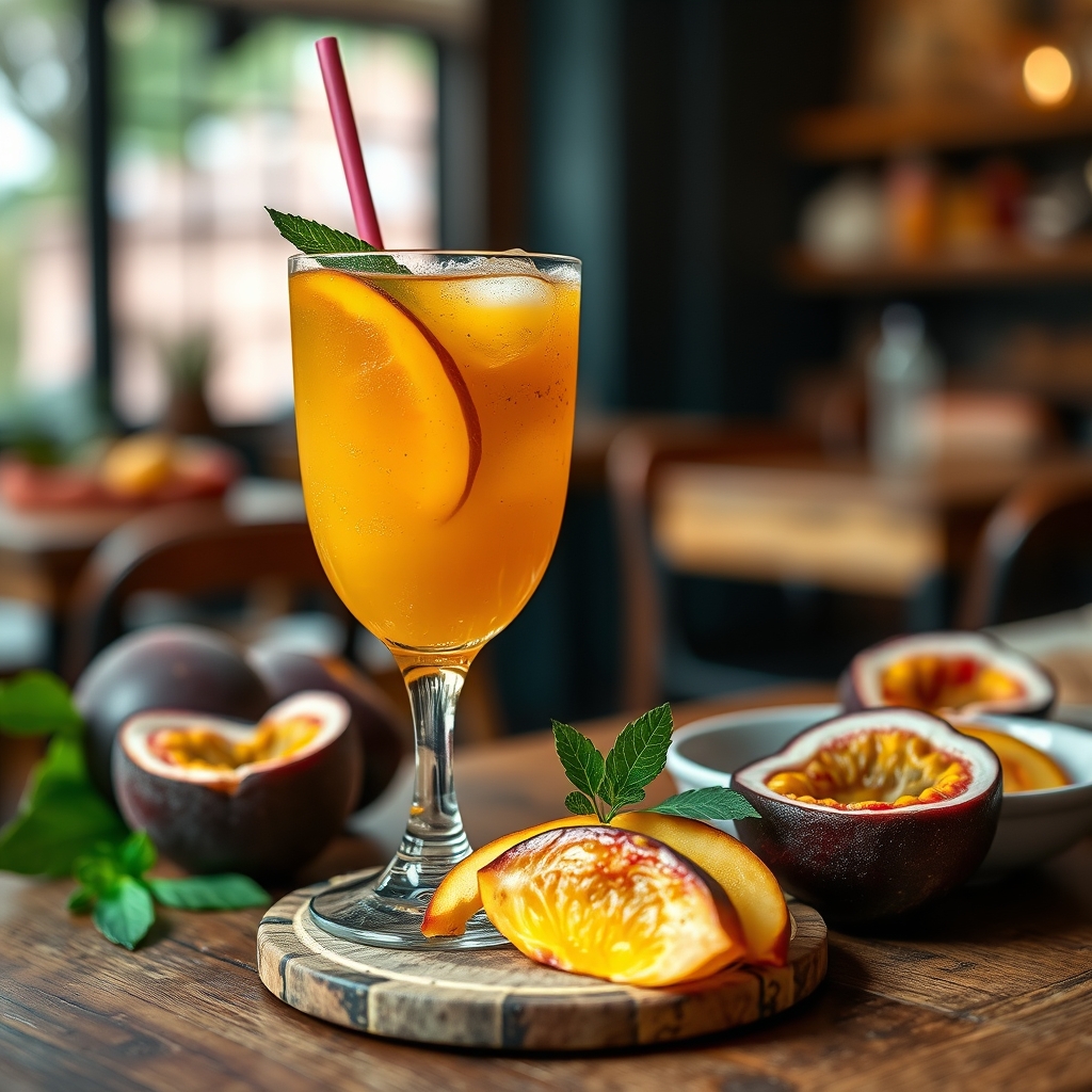A refreshing tropical iced tea blending sweet peaches and tangy passionfruit, perfect for hot summer days. This easy recipe uses real fruit for maximum flavor.