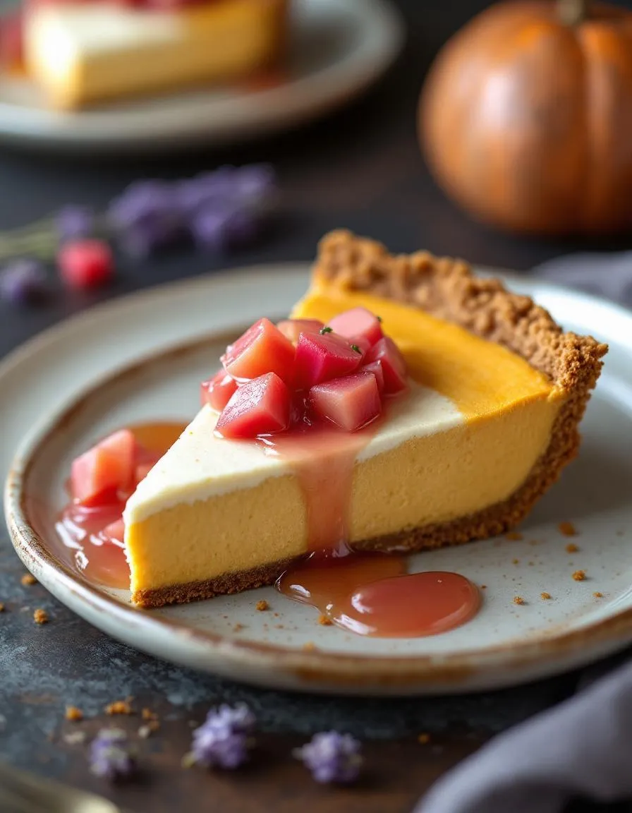 A creamy pumpkin cheesecake pie with a spiced gingersnap crust, topped with a tangy rhubarb and lavender compote.