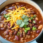 - Sprinkle the chili powder, cumin, oregano, salt, black pepper, and cayenne pepper (if using) over the mixture.Stir and cook for 1 minute to let the spices bloom, enhancing their flavor.4️⃣Add the Liquids and Beans:Stir in the diced tomatoes, tomato sauce, tomato paste, beef broth, kidney beans, and pinto beans.Mix thoroughly to combine all ingredients.5️⃣Simmer the Chili:Bring the mixture to a gentle boil, then reduce the heat to low.Cover and let the chili simmer for 30–45 minutes, stirring occasionally to prevent sticking.6️⃣Taste and Adjust:Taste the chili and adjust the seasoning as needed with additional salt, pepper, or spices.7️⃣Serve:Ladle the hot chili into bowls and serve with your favorite toppings like shredded cheese, sour cream, green onions, diced avocado, or tortilla chips.