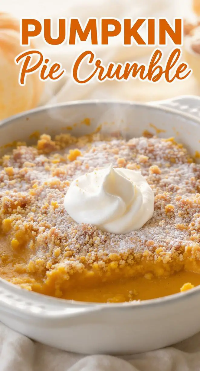 Serve this pumpkin pie crumble warm with a dollop of whipped cream or a scoop of vanilla ice cream for a decadent touch.