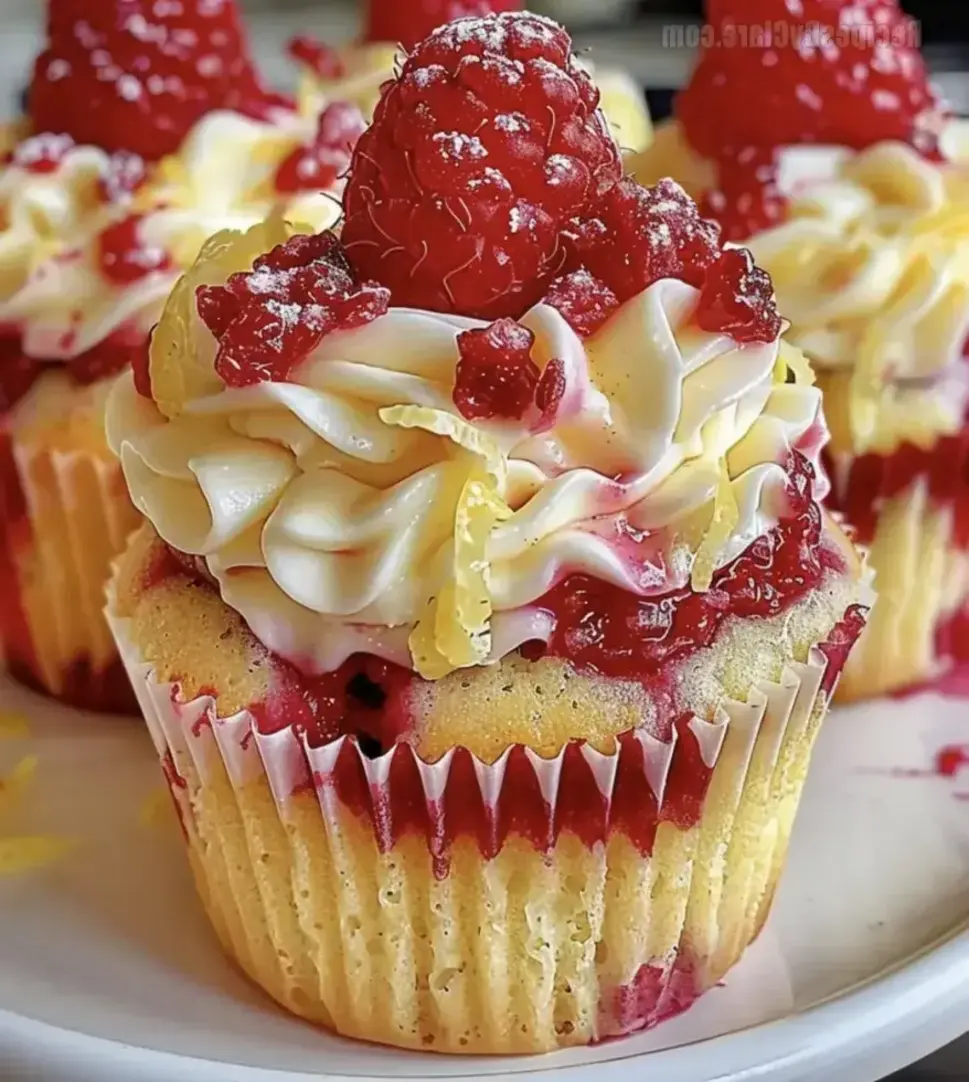 Freshly baked Raspberry Lemon Heaven Cupcakes with vibrant lemon cream frosting.