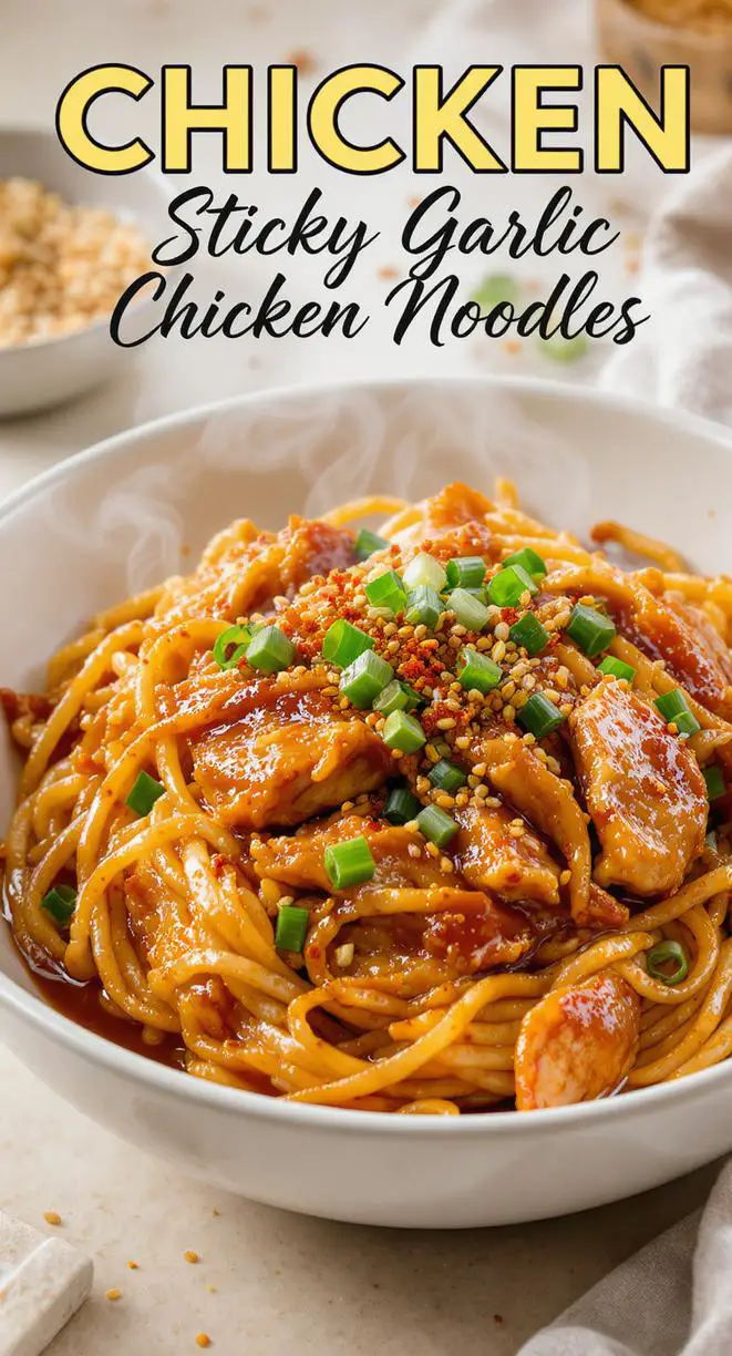 This sticky garlic chicken noodles recipe features tender chicken stir-fried in a sweet and savory garlic sauce, tossed with noodles for a quick and flavorful meal.