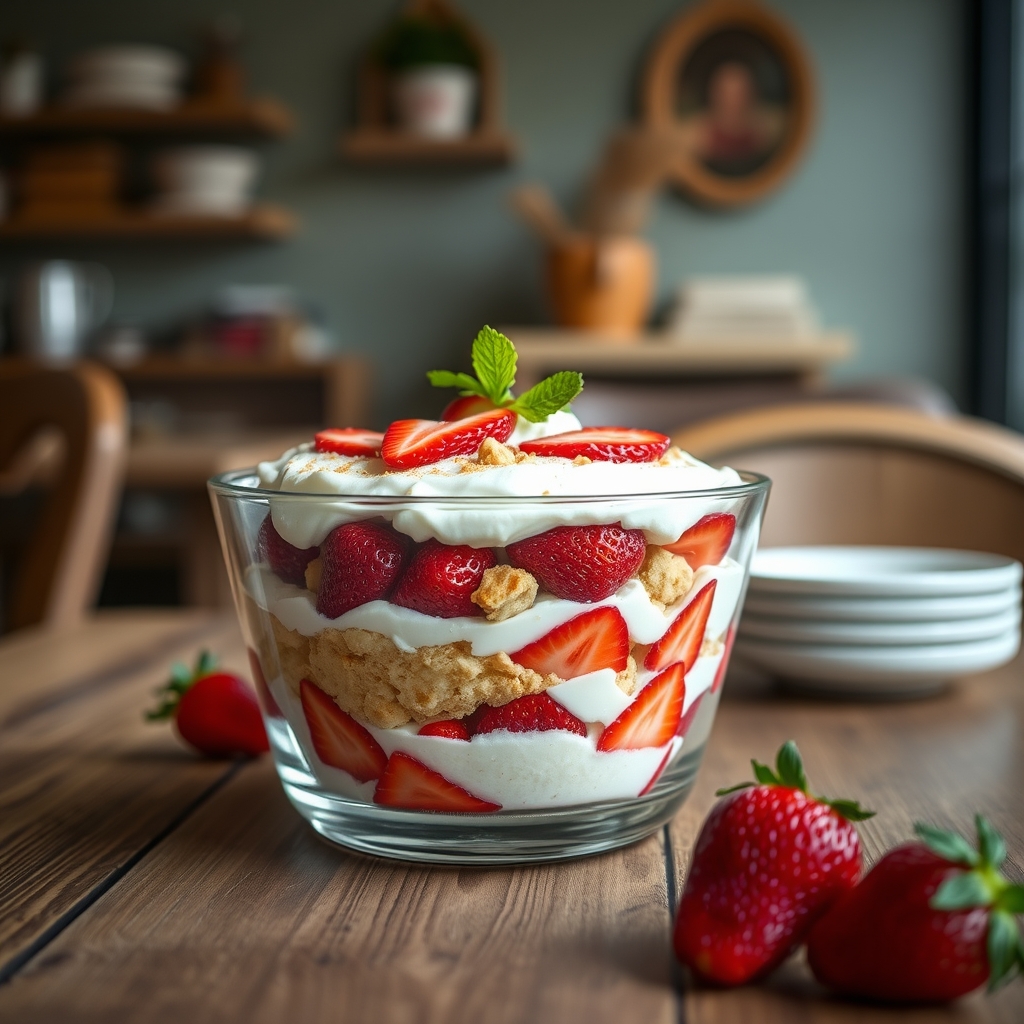 A delightful layered dessert featuring fresh strawberries, fluffy whipped cream, and tender shortcake cubes, perfect for summer gatherings.