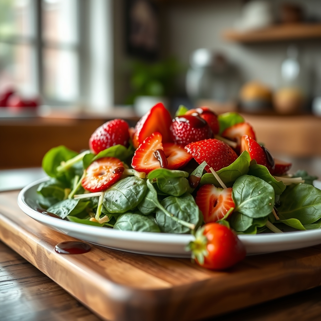 A refreshing and vibrant salad combining sweet strawberries, fresh spinach, creamy goat cheese, and crunchy almonds, all drizzled with a rich balsamic glaze. Perfect for summer gatherings or a light lunch.