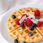 - Serve waffles with some fresh fruit and warm maple syrup.