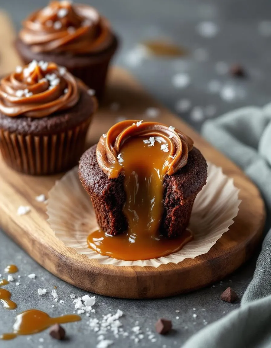 Rich chocolate cupcakes with a gooey salted caramel center, perfect for indulging your sweet tooth.