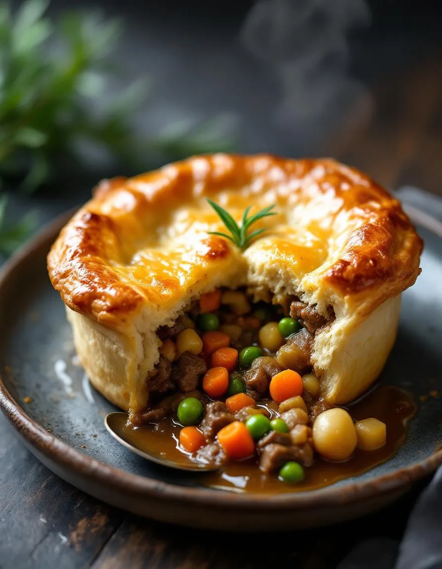 A rich and hearty pot pie featuring tender stout-braised beef and vegetables in a savory gravy, all encased in a flaky pastry crust.