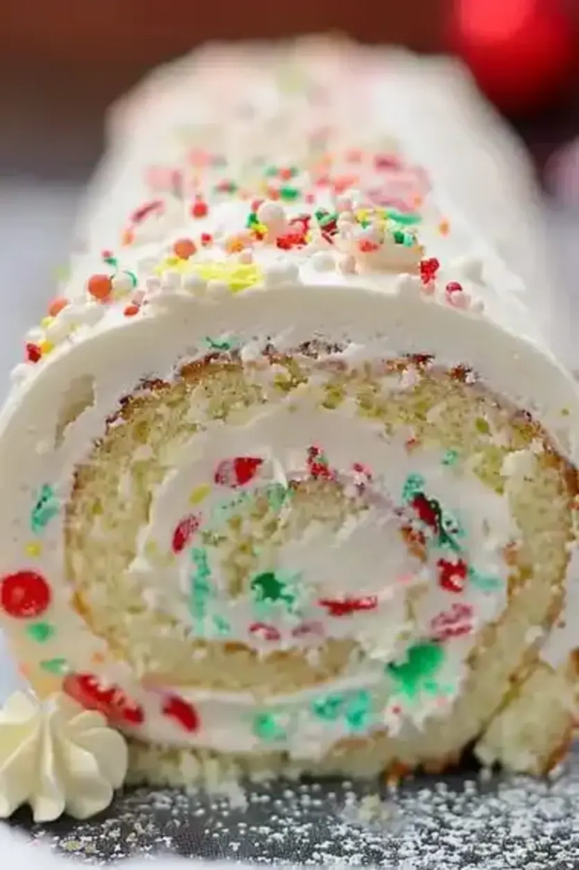 Embrace the holiday spirit with this enchanting Vanilla Christmas Roll Cake, a festive delight that captures the essence of Christmas cheer. Perfect for holiday gatherings, this visually stunning cake features soft, fluffy sponge rolled with creamy vanilla buttercream and festively adorned with holiday sprinkles and a drizzle of white chocolate.