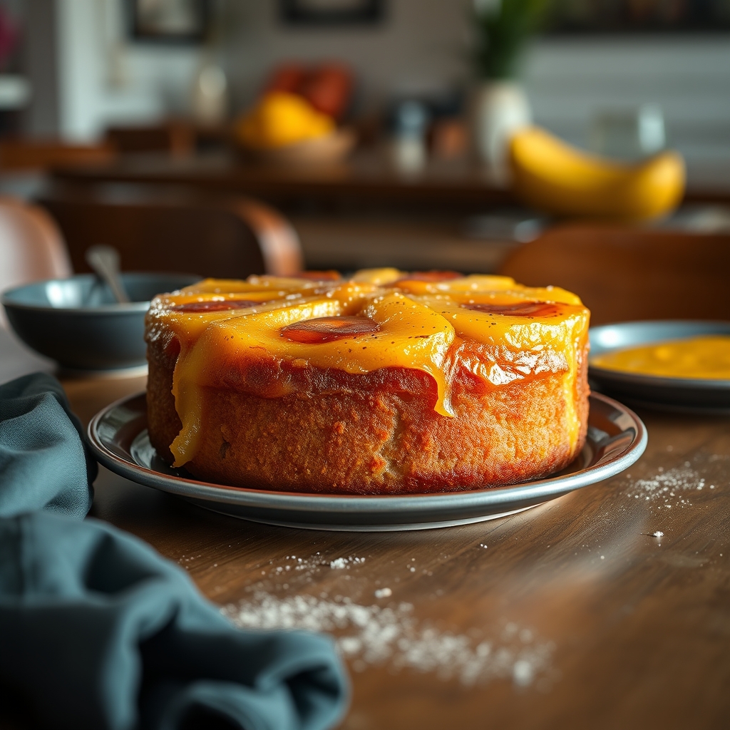 A nostalgic dessert featuring caramelized pineapple rings and maraschino cherries atop a moist vanilla cake. This retro favorite is perfect for potlucks or family gatherings.